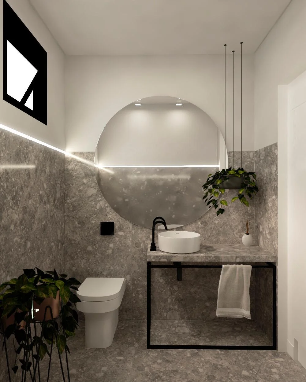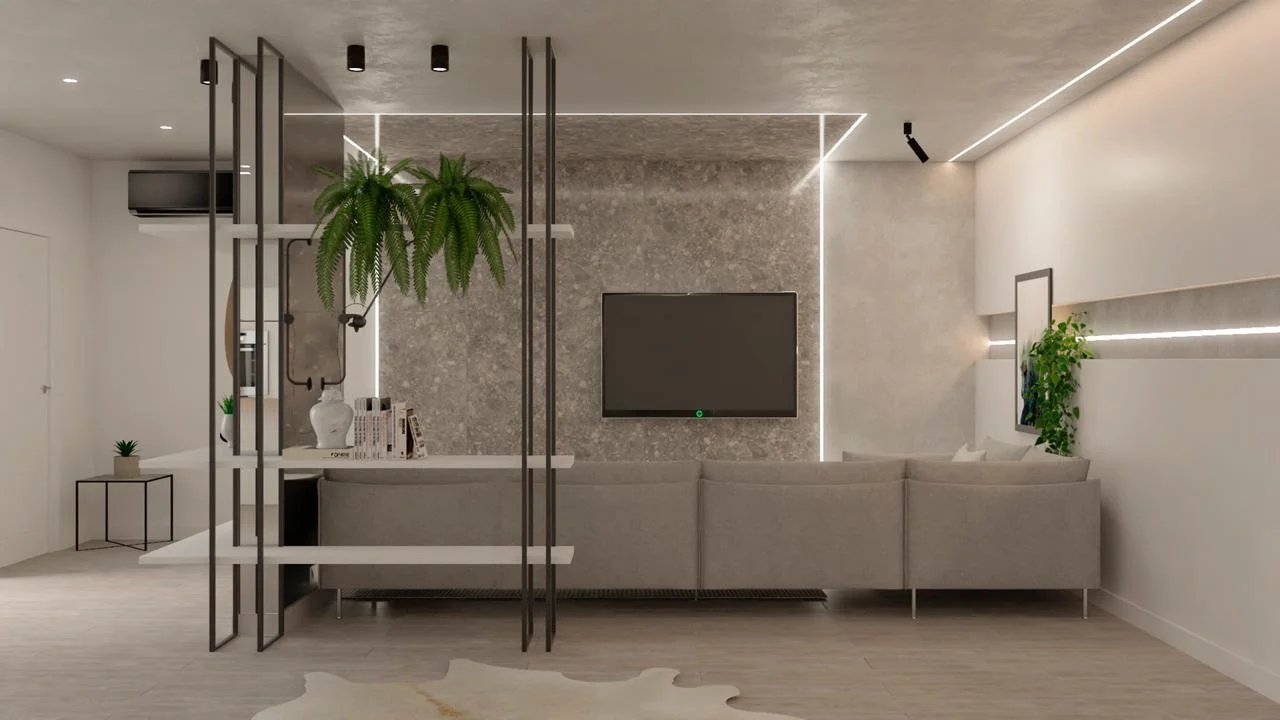 O que também não passa nada despercebido é o revestimento utilizado na sala e no banheiro. Foi inserido o Pietra Lombarda, uma pedra cinza com pedaços de outras rochas em sua composição que garantem muita beleza ao espaço.
