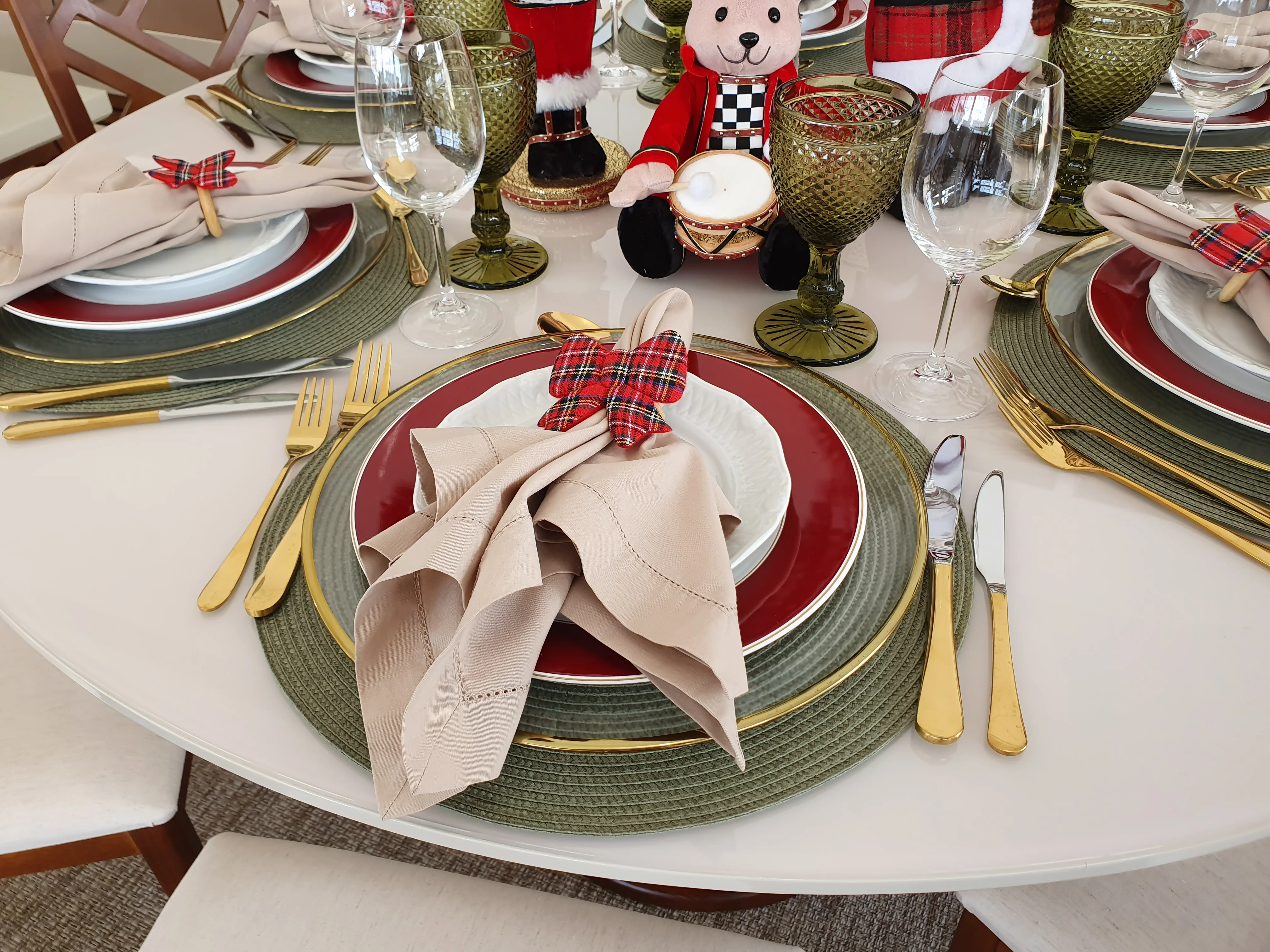 A mesa montada para a ceia de Natal conta com jogo americano. Glaucia explica que não é um item obrigatório, mas pode ser usado para trazer um charme a mais para a mesa.
