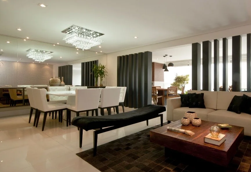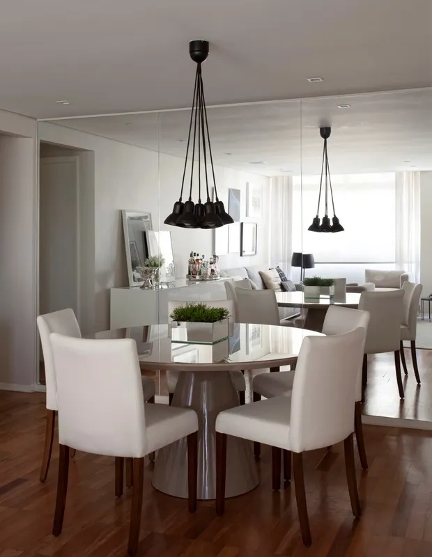 Os espelhos podem ampliar todos os ambientes sem distinção, desde a sala de jantar e tv, até mesmo o corredor de passagem.