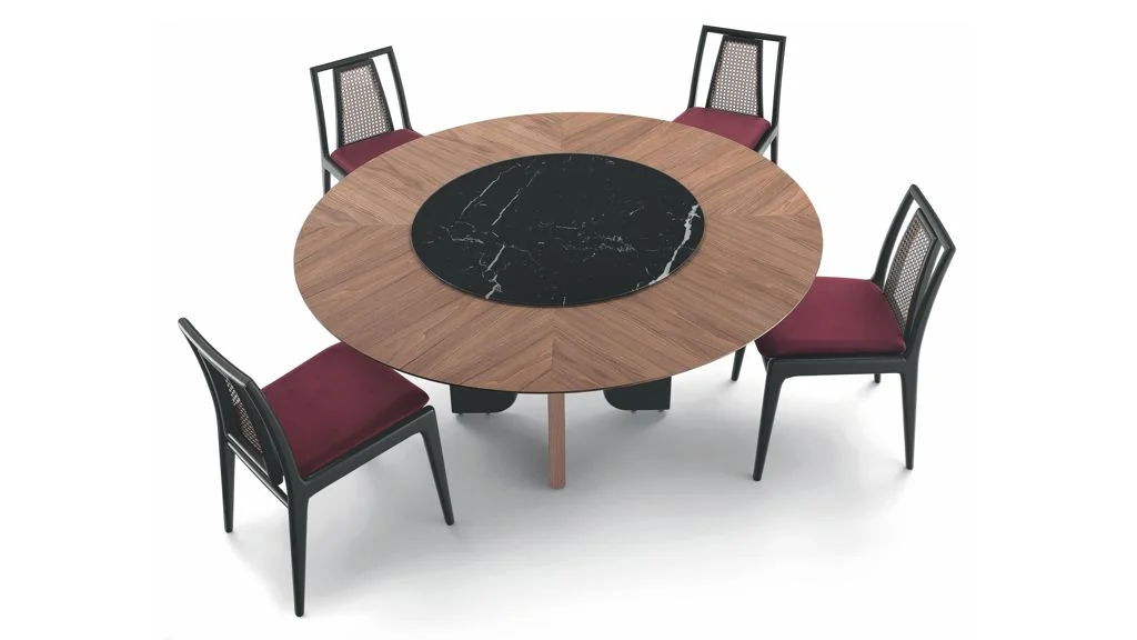 Uma das peças disponíveis na Maison Fratelli é a mesa Moon, uma releitura dos anos 1960. O pé curvo e as formas geométricas ‘encaixadas’ no produto garantem um design exclusivo. A mesa, super resistente, tem pés em madeira maciça intertravados pela estrutura de fixação, o que evita a movimentação da estrutura. O tampo é de MDF laminado e tem a opção com disco giratório ou sem.
