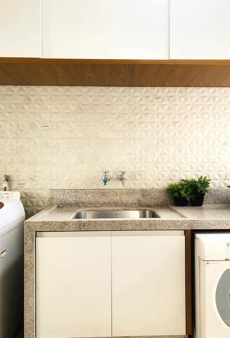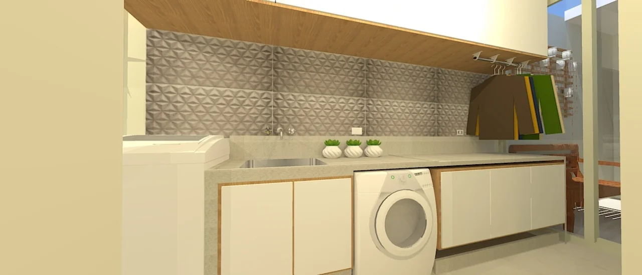 “Tudo depende de cada espaço a ser projetado. Geralmente colocamos bancadas em granito ou mármore para evitar o contato da água com os móveis. Além disso, na lavanderia é preciso ter um revestimento em pedra ou porcelanato logo acima da bancada. Isso impede que a água molhe a parede e provoque problemas futuros. Também é importante lembrar que a lavanderia precisa ser um ambiente ventilado” detalha Letícia.