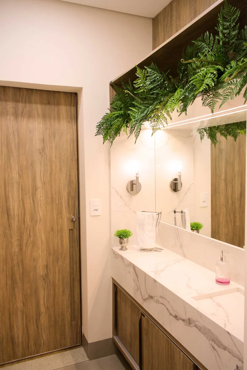 O uso das folhagens, por exemplo, foi adotado pelas irmãs Bührer ao desenvolverem o banheiro social. “Desenvolvemos dessa maneira, independente, com separação do espaço de chuveiro e bacia sanitária de bancada e lavatório, pois ele atende dois quartos e dessa forma pode ser utilizado de forma independente tornando-o mais funcional. A bancada de fora-a-fora alongada serviu para liberar espaço de circulação sem perder área de armazenamento. O caixote em cima emoldurou o espaço e possibilitou uma iluminação elegante e difusa”, conclui Fernanda.
