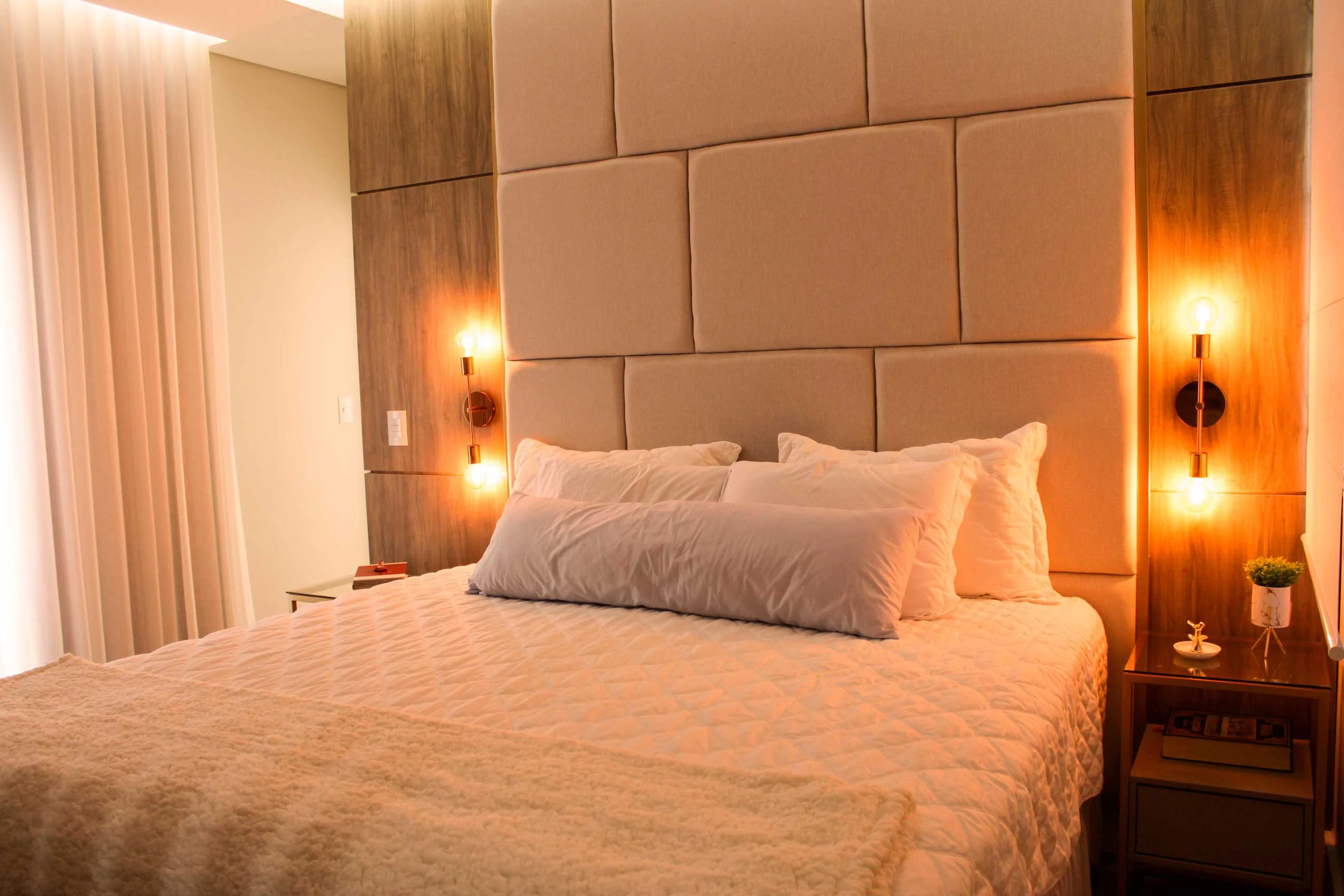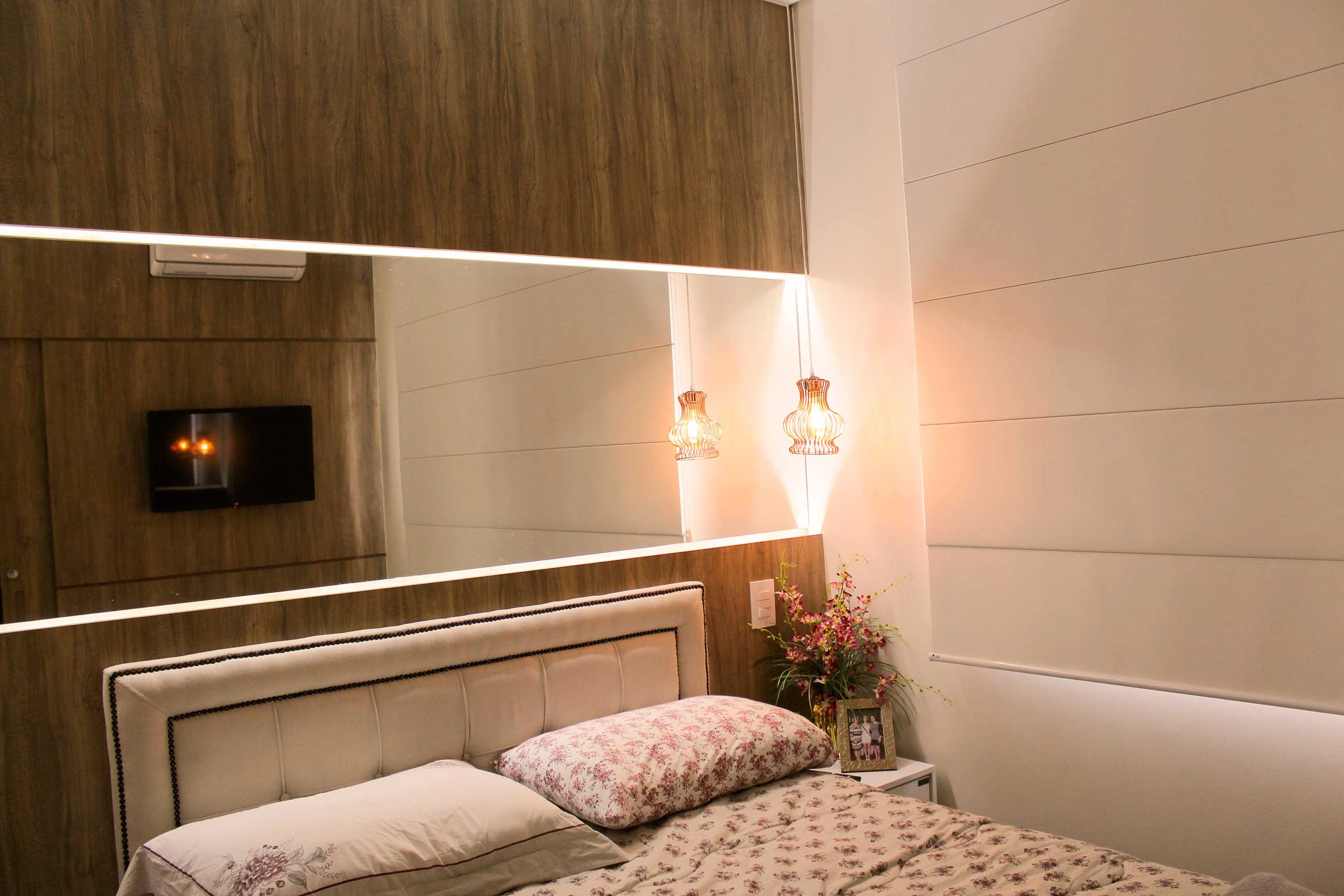 Em um dos quartos, apesar de terem seguido a mesma cartela de cores, as arquitetas acrescentaram um espelho na parte superior da cama. “Este quarto tinha um ambiente menos espaçoso, então o espelho foi posicionado na horizontal para gerar a sensação de alongamento e amplitude”, comenta. Na suíte, por sua vez, por se tratar de um ambiente maior, o método utilizado foi outro. “Nós trabalhamos com elementos na vertical e reforçamos com itens em dourado para remeter a sofisticação”, reforça.