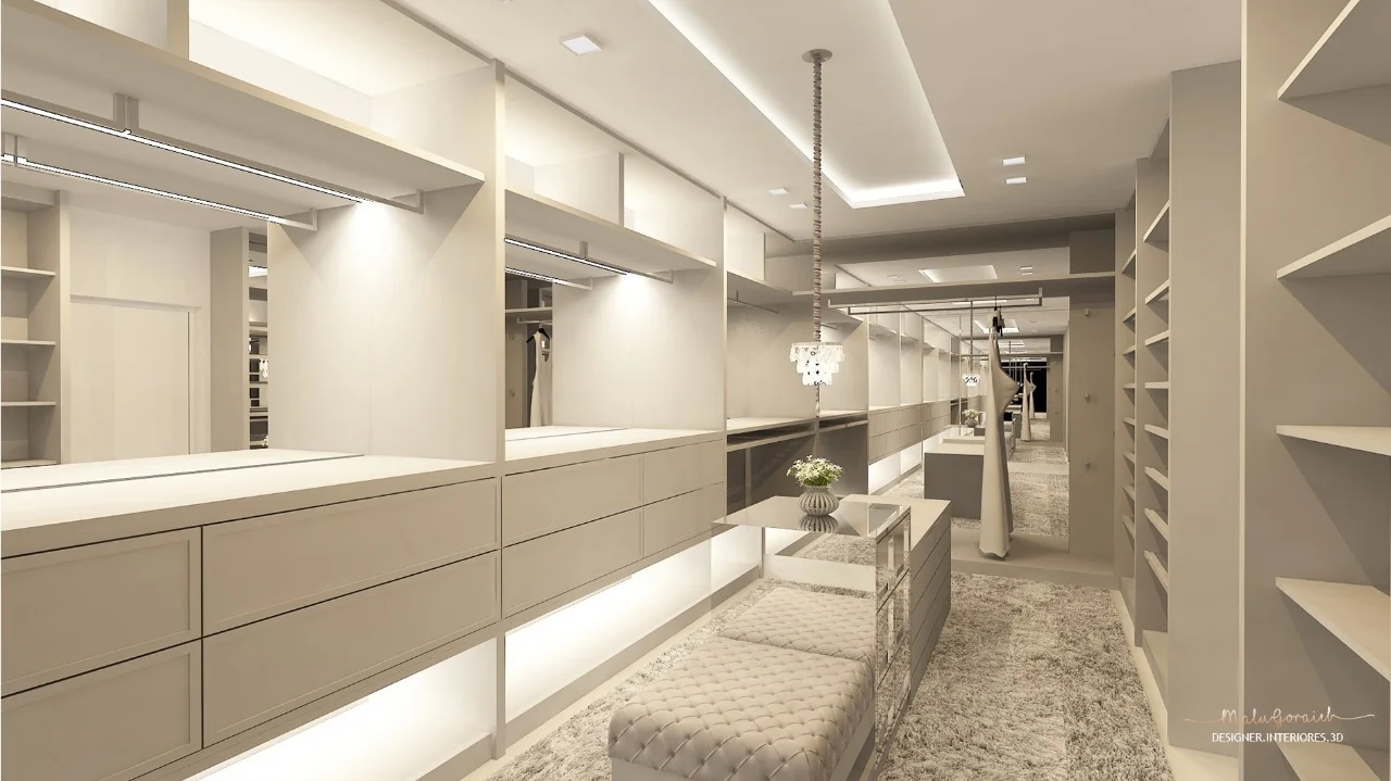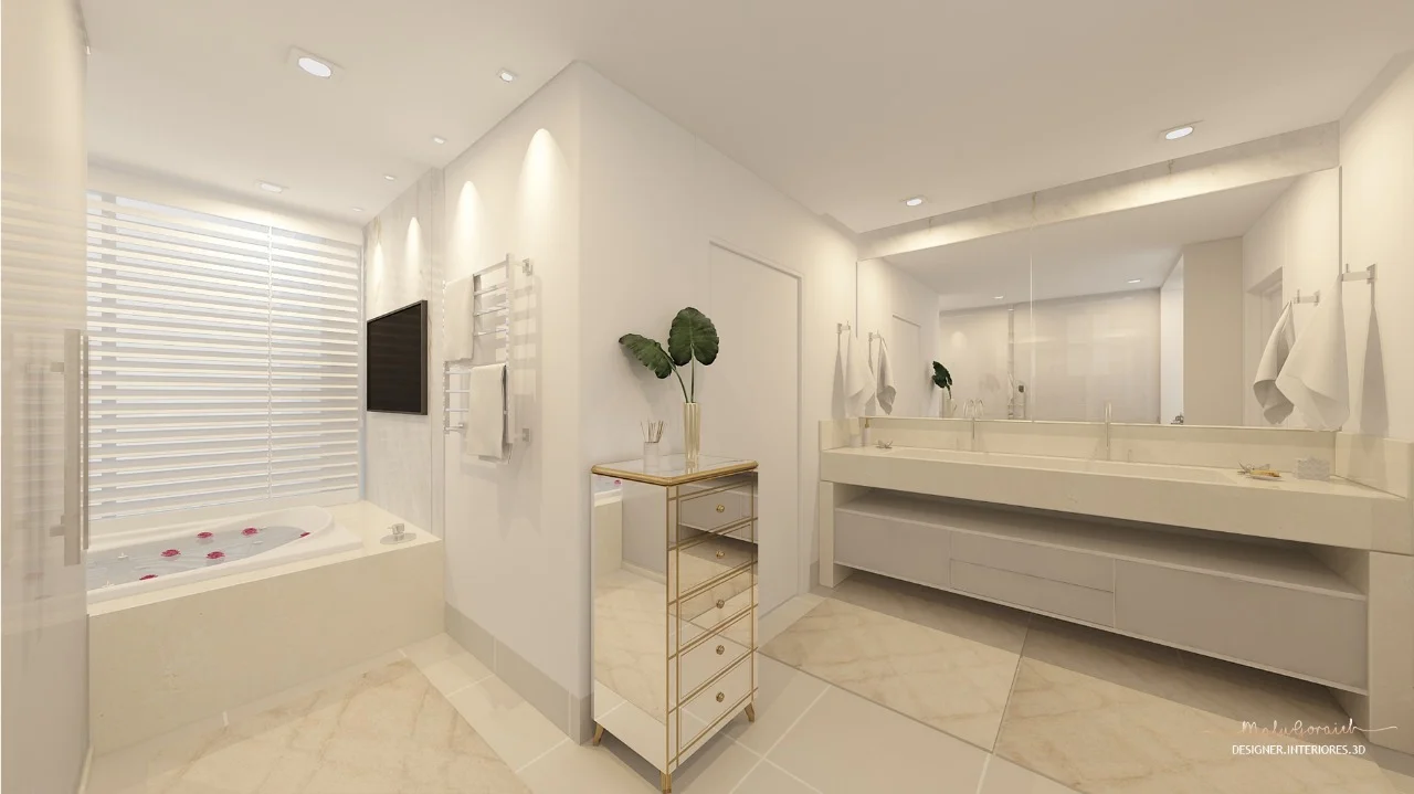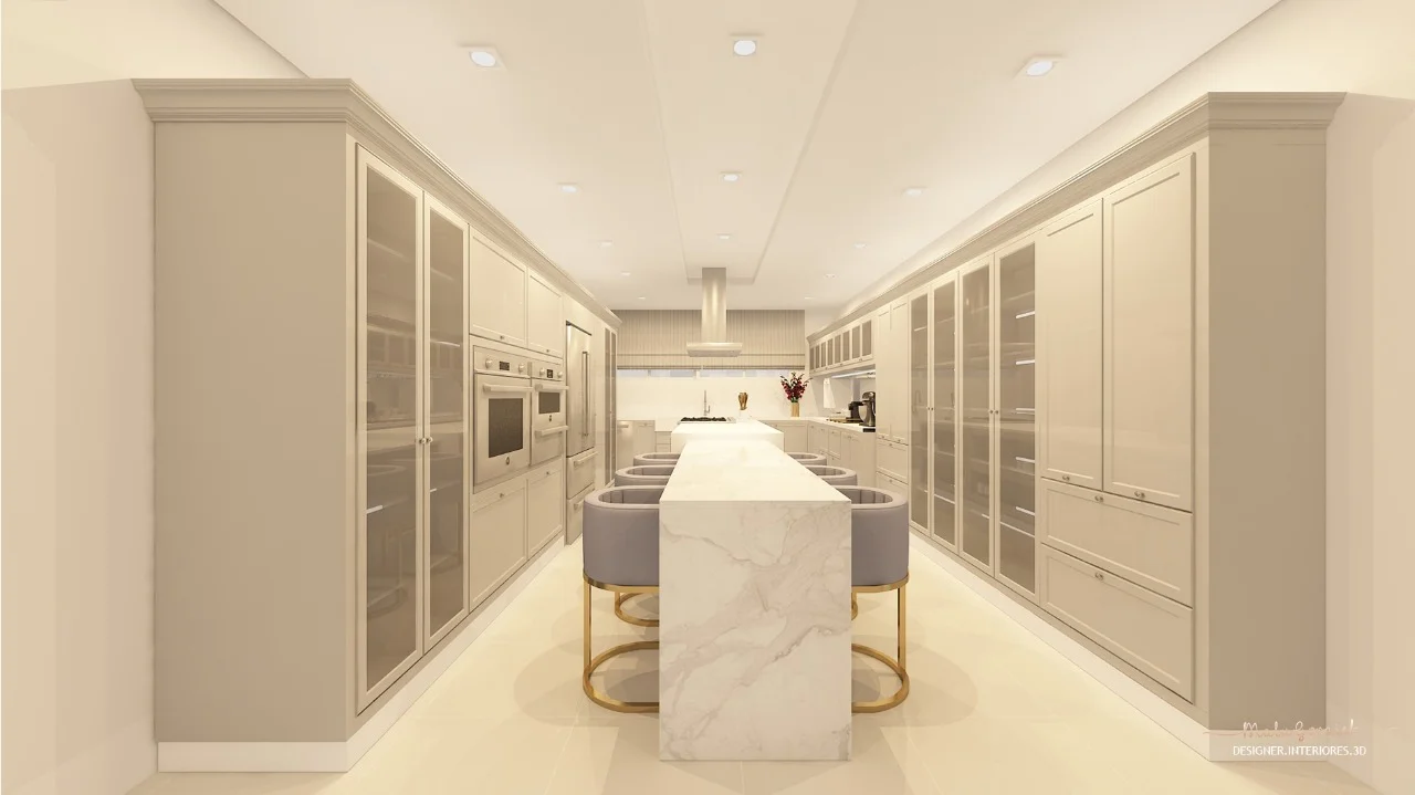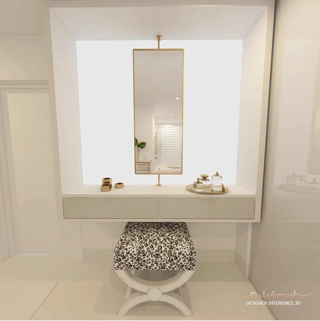 A designer de interiores ressalta a importância cores neste projeto. Foi definida uma paleta cinza com branco e dourado.