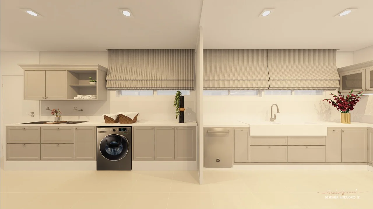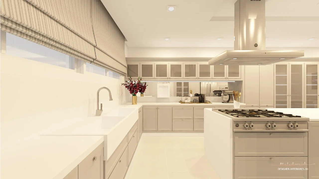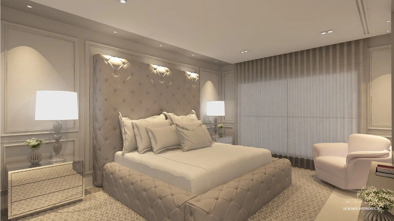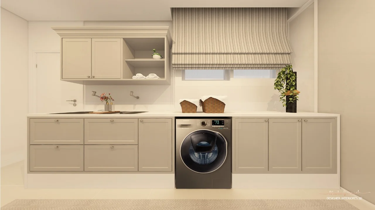 A designer de interiores ressalta a importância cores neste projeto. Foi definida uma paleta cinza com branco e dourado.