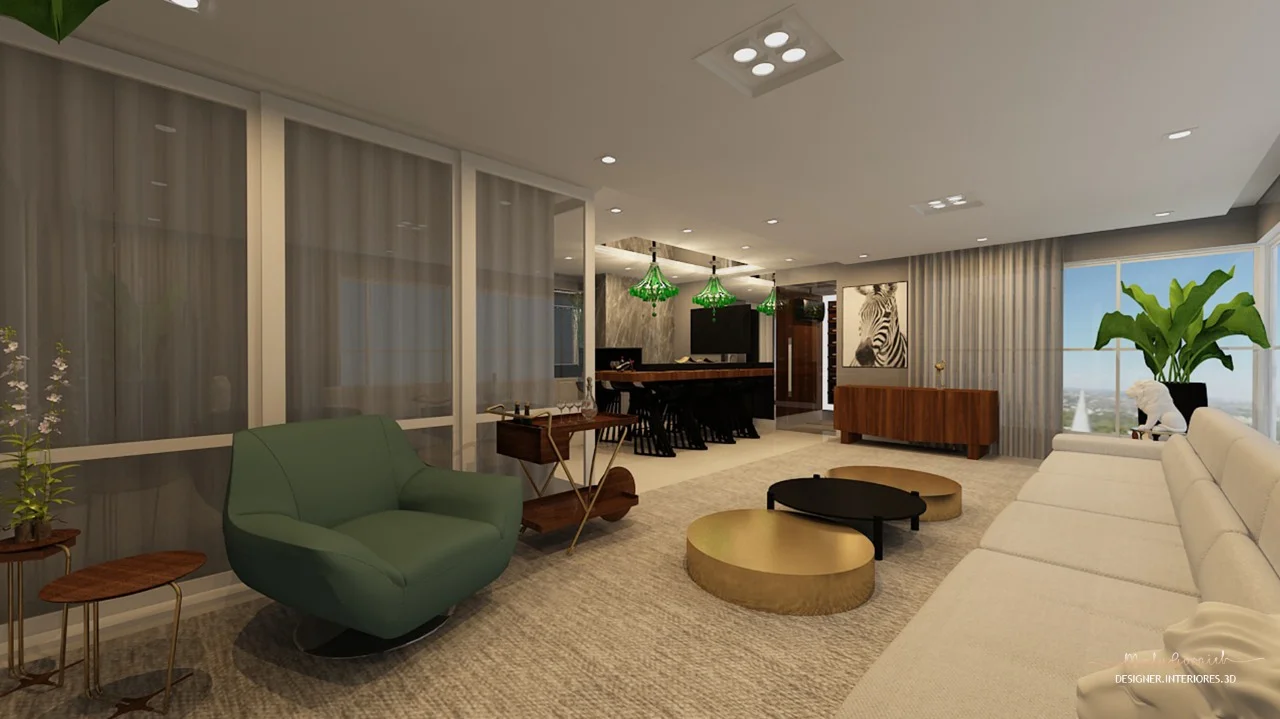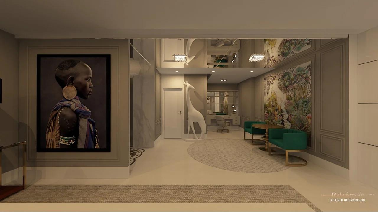 O projeto foi inspirado em uma viagem que a cliente fez para a África. Nas imagens é possível identificar elementos que remetem à cultura desse continente, como a presença da cor verde no lustre, nas poltronas e nas plantas, além dos imponentes quadros.