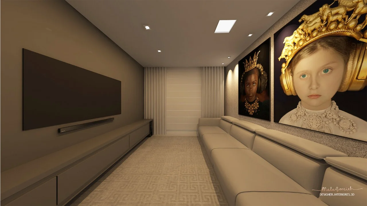 Na sala de home theater e nos quartos, que são ambientes mais íntimos e relaxantes, foi inserida uma luz neutra e amarela em um misto de luz indireta, direta e fitas de led, conforme detalhou a designer de interiores.