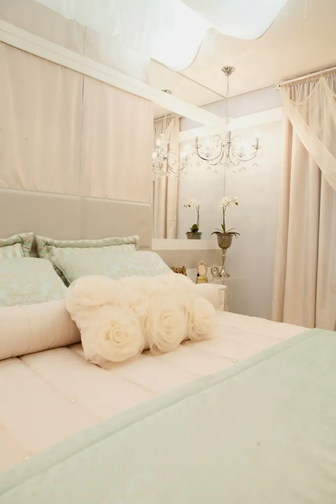 “Deixam muito elegante e refletem o clima romântico do ambiente. Os tecidos do docel em conjunto com as almofadas, cortinas, colchas e saia da cama deram o tom da paleta de cores deste quarto”, explica.