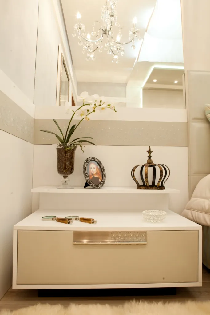 A poltrona, explica a arquiteta, complementou e trouxe mais delicadeza para o quarto. Além disso, compõem o ambiente os criados-mudos, o lustre, a iluminação mais quente e as decorações. Porta-retratos, vasos com plantas, relógios e outros elementos propiciaram ao quarto o ar de moderno.