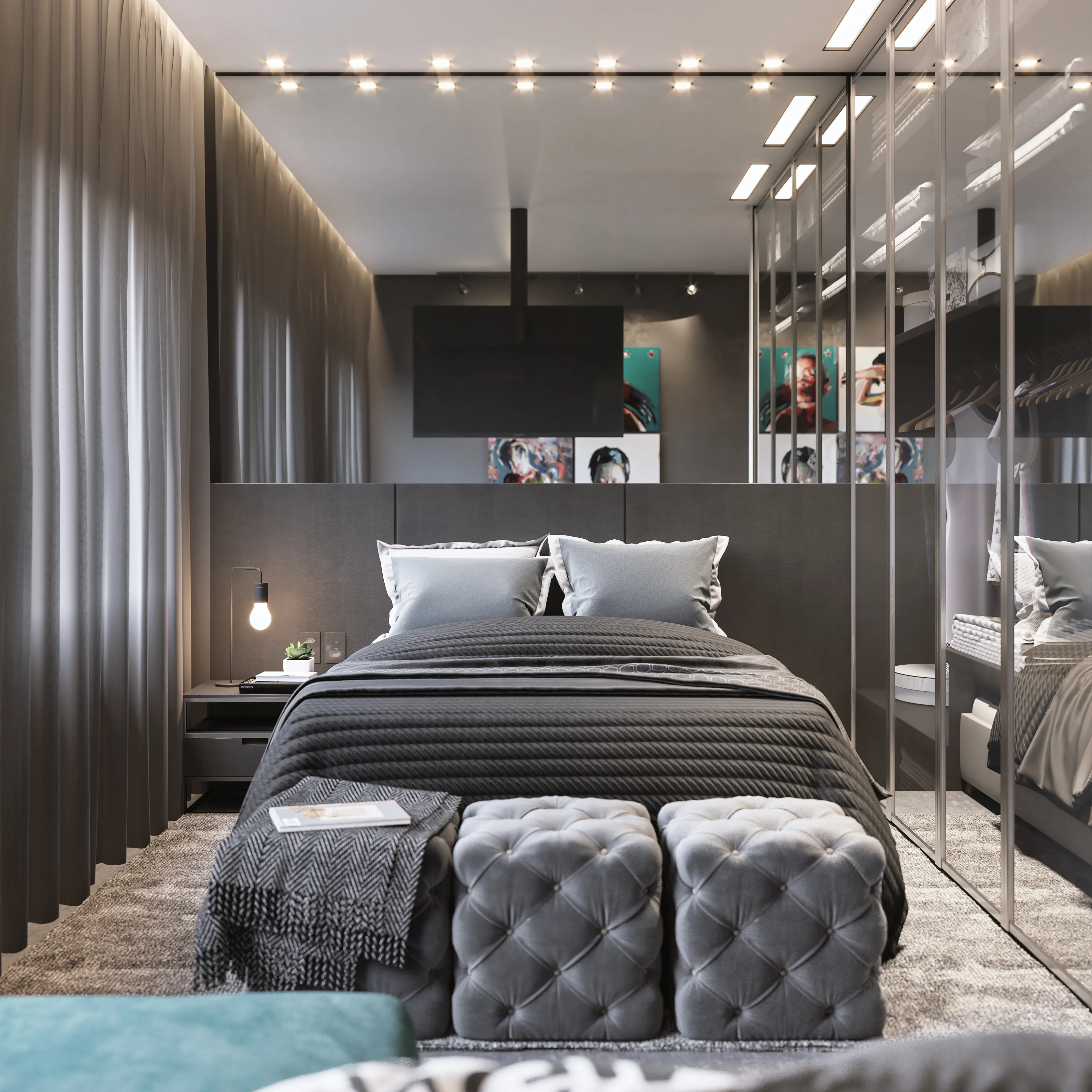 “Como as imagens mostram, o uso predominante foi das cores cinza e azul, que foram escolhidas logo na concepção do projeto. Tais cores foram determinadas por se referirem a duas sensações principais: o cinza trazendo o conceito minimalista para o projeto, e o azul, utilizado principalmente em móveis soltos e elementos decorativos, trazendo um ar acolhedor e sofisticado. No geral, a paleta de cores foi elaborada pensando em trazer sobriedade ao projeto, porém fugindo da monotonia”, finaliza.