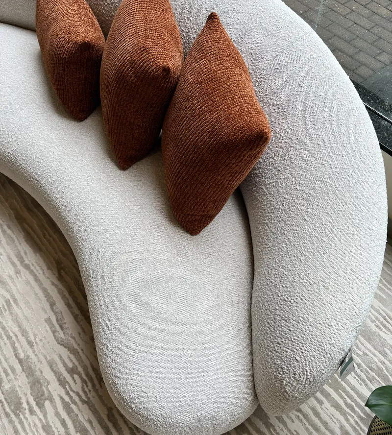 - Cores Neutras: Opte por um sofá curvo em uma paleta de cores neutras, como bege ou cinza, para criar um espaço sofisticado que pode ser facilmente complementado com toques de cor através de almofadas e obras de arte.
