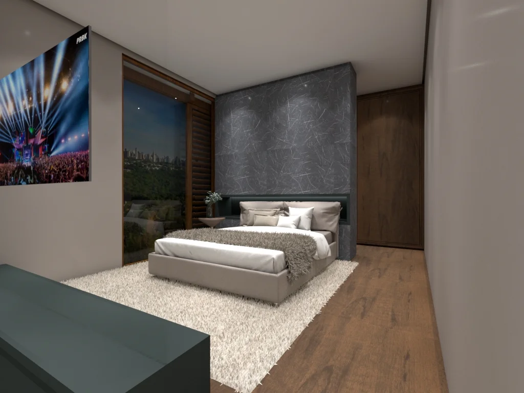 A madeira com um tom marrom mais acentuado está presente no painel ripado e no piso do quarto. O material proporciona a sensação de conforto, rusticidade e estabilidade. No mesmo painel ripado, foram inseridos espelhos em formatos orgânicos de seixos para quebrar a monotonia do ripado e, ao mesmo tempo, valorizar o espaço.